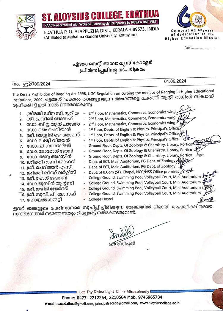 In accordance with the supreme court directives on ragging (2007), the judgement of supreme court on ragging (2009) and the UGC regulations to curb the menace of ragging (2009) St. Aloysius College Edathua has formed an anti-ragging committee to completely wipe out this in-human practice from the campus.