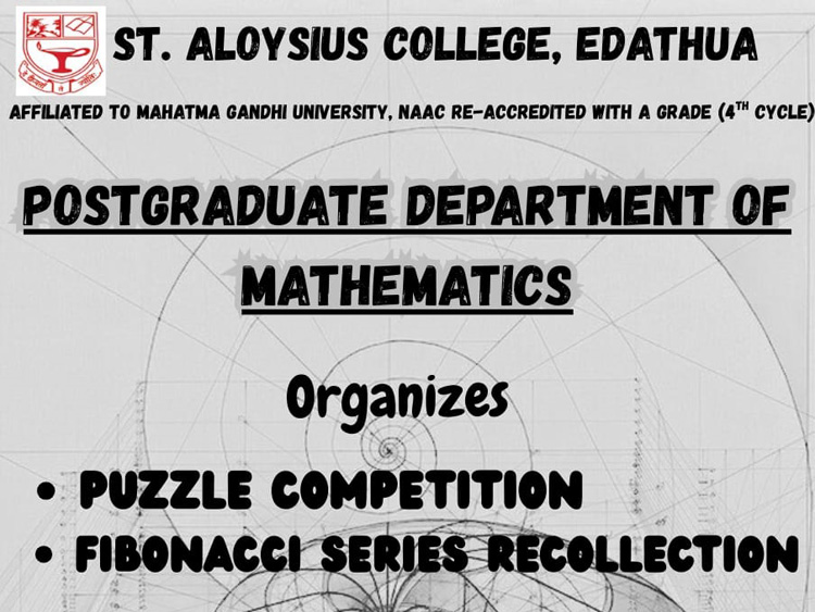 With the winners of the competitions held in connection with the Fibonacci Day observance organized by the Postgraduate Department of Mathematics on 24.11.2025 Puzzle Competition 1. Josmy AntonyRosmi James→ I M.Sc. Mathematics 2. R. YedhukrishnanAbhishek T→ III B.Sc. Mathematics Fibonacci Series Recollection 1. Rosmi James→ I M.Sc. Mathematics 2. Nousfiya Nazar→ III B.Sc. Mathematics