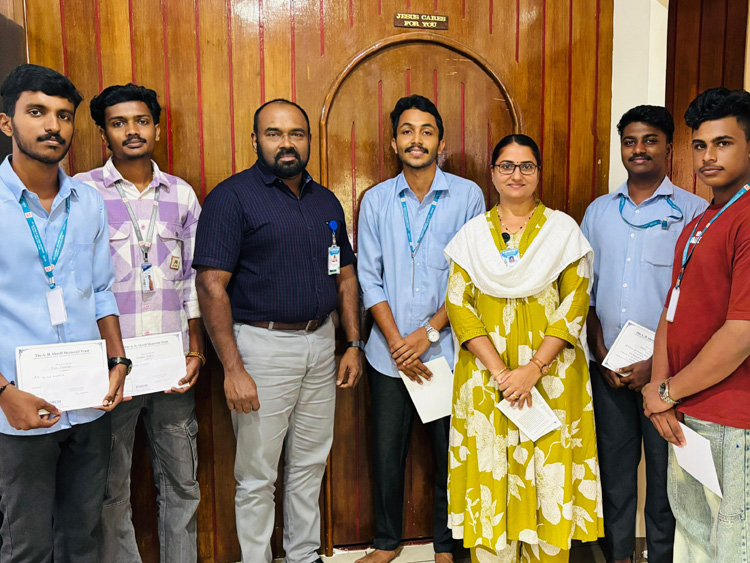 With the winners of the 59th A.D. Shroff Memorial Debate Competition: First Position: Alex S. Mathew (III BA English) Second Position: Tim Cherian (I BA English) Third Position: Sharon Joseph (I M.Com) Fourth Position: Johan Jacob (III B.Com – F&T) Fifth Position: Kashinath P. J. (I B.Com – F&T)