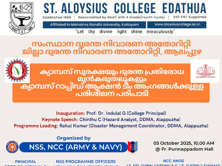 The Campus Rapid Action Team was formed today, and the awareness program organized by the NCC and NSS units of our Institution, in collaboration with the District Disaster Management Authority, Alappuzha, was formally inaugurated. https://www.aloysiuscollege.ac.in/wp-content/uploads/2025/10/the-campus-rapid-action-team.mp4