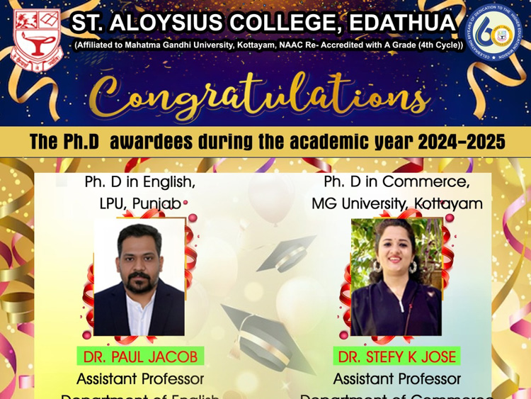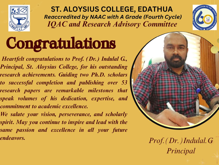 Congratulations Heartfelt congratulations to Prof. (Dr.) Indulal G., Principal, St. Aloysius College, for his outstanding research achievements.