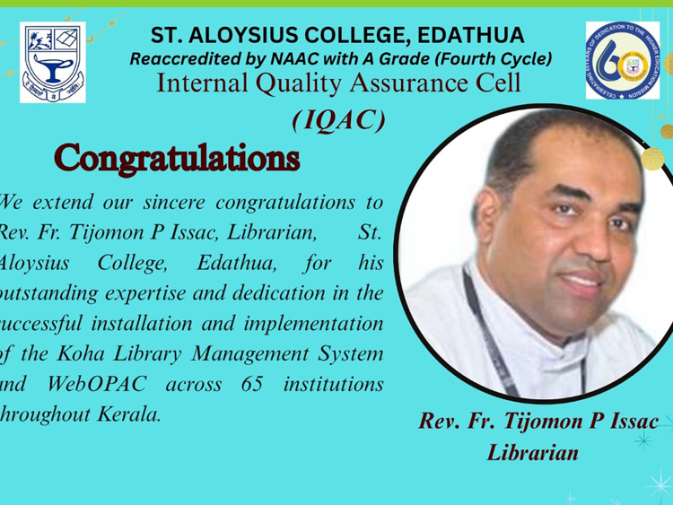 We extend our sincere congratulations to Rev. Fr. Tijomon P Issac, Librarian, St. Aloysius College, Edathua