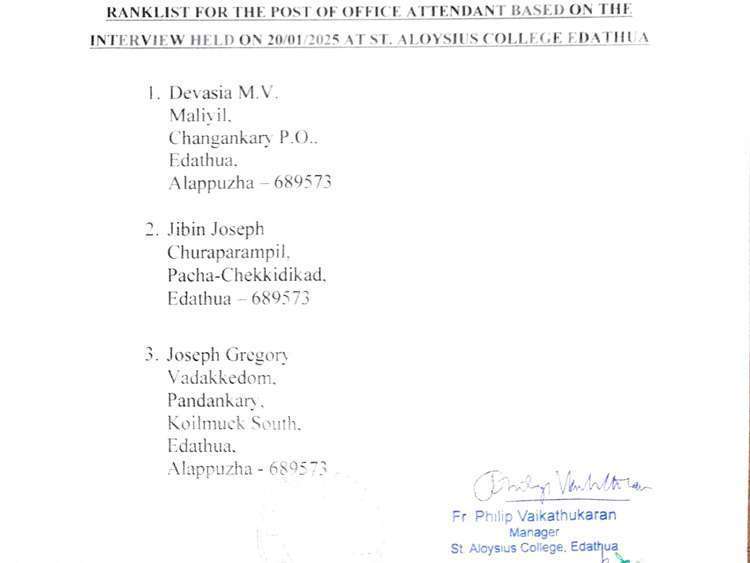 Ranklist for the Post of Office Attendant Based on the Interview held on 20/01/2025 at St. Aloysius College Edathua