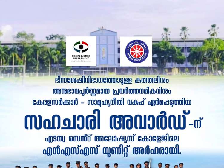സഹചാരി പുരസ്കാരം എടത്വ സെൻ്റ്. അലോഷ്യസ് കോളേജ് എൻഎസ്എസ് യൂണിറ്റിന്. ഭിന്നശേഷിവിഭാഗത്തോടുള്ള കരുതലിനും അനുഭാവപൂർണ്ണമായ പ്രവർത്തനമികവിനും കേരളസർക്കാർ – സാമൂഹ്യനീതി വകുപ്പ് ഏർപ്പെടുത്തിയ സഹചാരി പുരസ്കാരം എടത്വ സെൻ്റ്. അലോഷ്യസ് കോളേജ് എൻ. എസ്. എസ്. യൂണിറ്റിന് ലഭിച്ചു. ഇക്കഴിഞ്ഞ വർഷം ഭിന്നശേഷി മേഖലയിൽ നടത്തിയ മികവുറ്റ വിവിധ പ്രവർത്തനങ്ങളാണ് സഹചാരി പുരസ്കാരത്തിന് എൻഎസ്എസ് യൂണിറ്റിനെ അർഹരാക്കിയത്. തൃശ്ശൂരിൽ വച്ച് നടന്ന അന്താരാഷ്ട്ര ഭിന്നശേഷി ദിനാചരണ സമ്മേളനത്തിൽ ബഹു. ഉന്നത വിദ്യാഭ്യാസ മന്ത്രി ഡോ. ആർ. ബിന്ദുവിൽനിന്ന് […]
