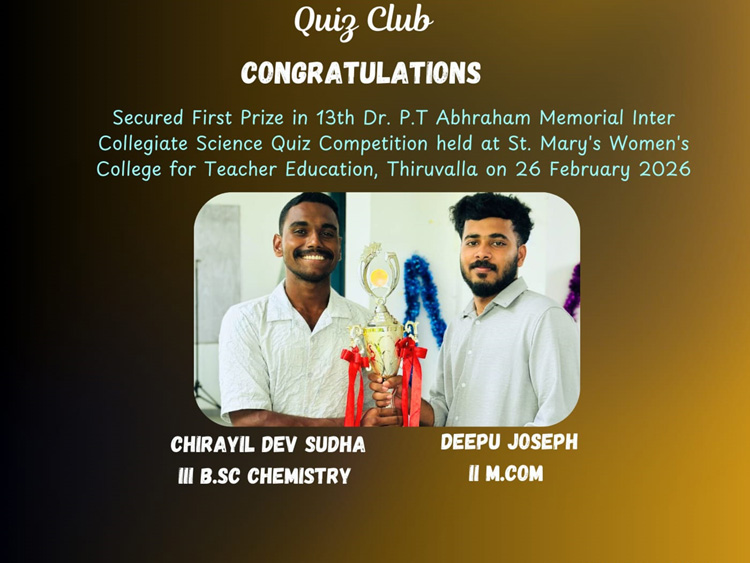 Happy to share that Mr. Dev Sudha Chirayil of the Department of Chemistry and Mr. Deepu Joseph of Department of Commerce have brought laurels to our institution by securing first place in the Dr. P T Abraham Memorial intercollegiate science quiz Competition held today at St. Mary’s College, Thiruvalla. Heartfelt congratulations to our dear wards […]