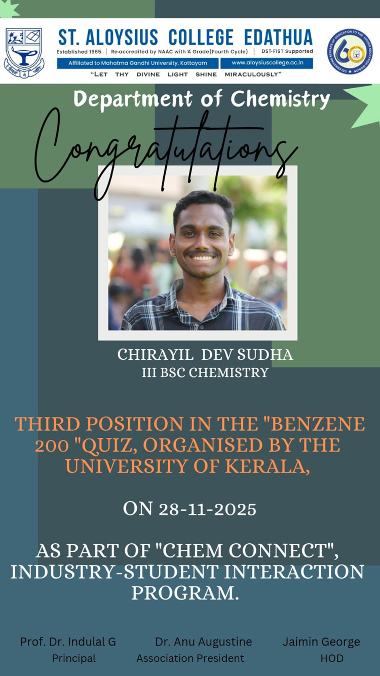 Home » Congratulations Chirayil Dev Sudha Third Position in the “Benzene 200 “Quiz, Organised by the University of Kerala