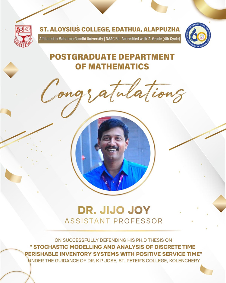 The Aloysian family extends its heartfelt joy and warmest congratulations to Dr. Jijo Joy on this remarkable achievement.