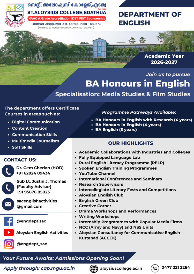 Under the leadership of a team of young, vibrant faculty members, the English Association of the department hosts Rhapsodia Literaria, an annual All-Kerala literary festival for Schools and Colleges. Fortnightly or monthly activities are conducted through the Aloysian English Club under the initiative of the energetic student community of the department. Debates, creative writing contests, field visits, film screenings, and author sessions enrich student life beyond the classroom. Creative Corner is a platform designed for our students to express their creativity. Our students have an active engagement in digital media platforms like YouTube, Instagram and Facebook both for learning and entertainment purposes.