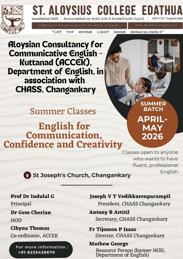 The ACCEK initiative and the Summer Batch of Communicative English classes, organized under the auspices of the Department of English of our institution, were inaugurated today by Dr. Gem Cherian, Head of the Department of English, at St. Joseph’s Church, Changankary.