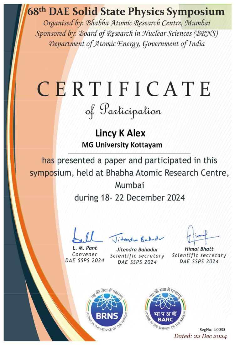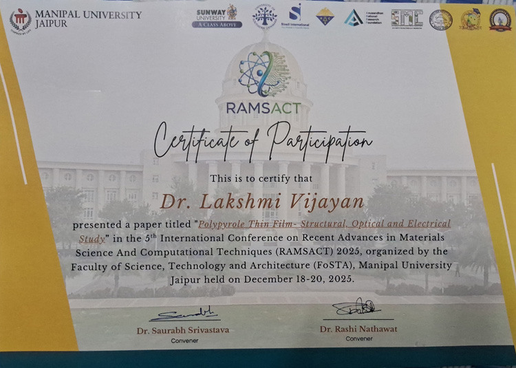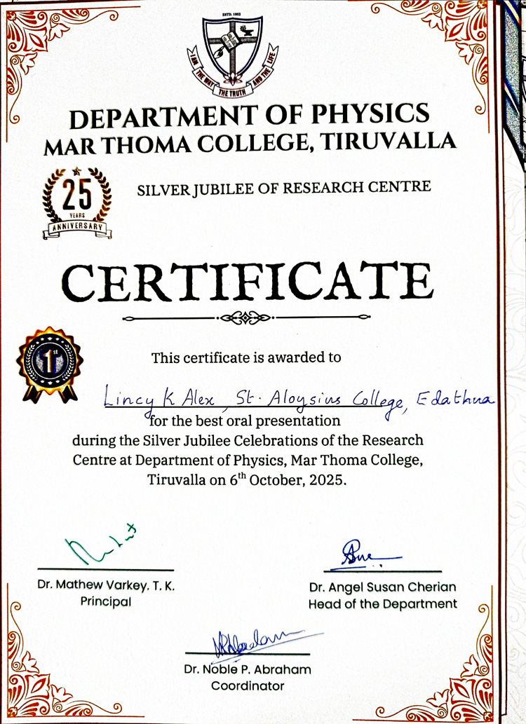 - Research Centre in Physics affiliated to Mahatma Gandhi University, Kottayam, Kerala in 2018