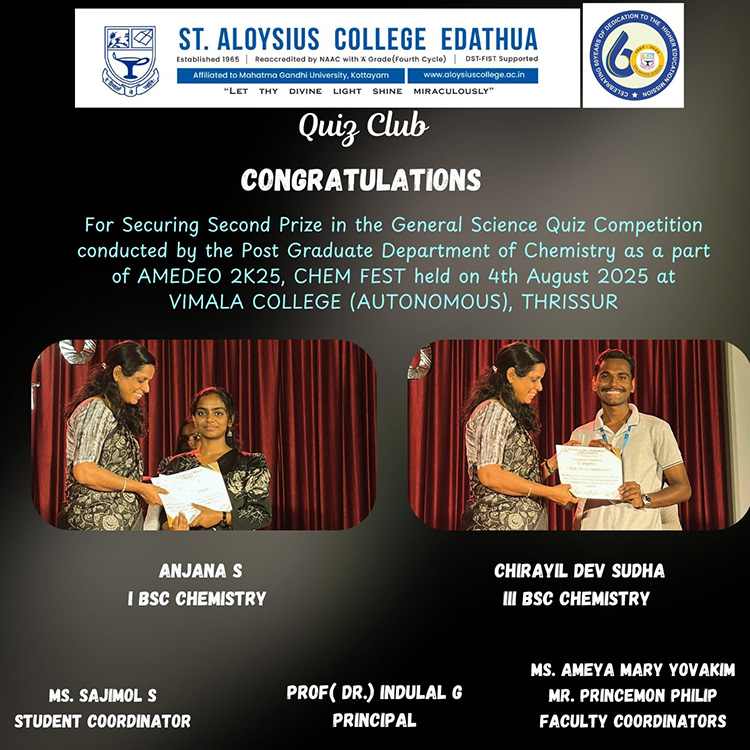 Hearty Congratulations! – We are delighted to share that Chirayil Dev Sudha and Anjana S from the Department of Chemistry have secured Second Prize in both the Science Quiz and the Periodic Table Arrangement Competition held today at Vimala College, Thrissur, organized by their Department of Chemistry. They have also been awarded cash prizes worth ₹1000/- in recognition of their commendable performance.