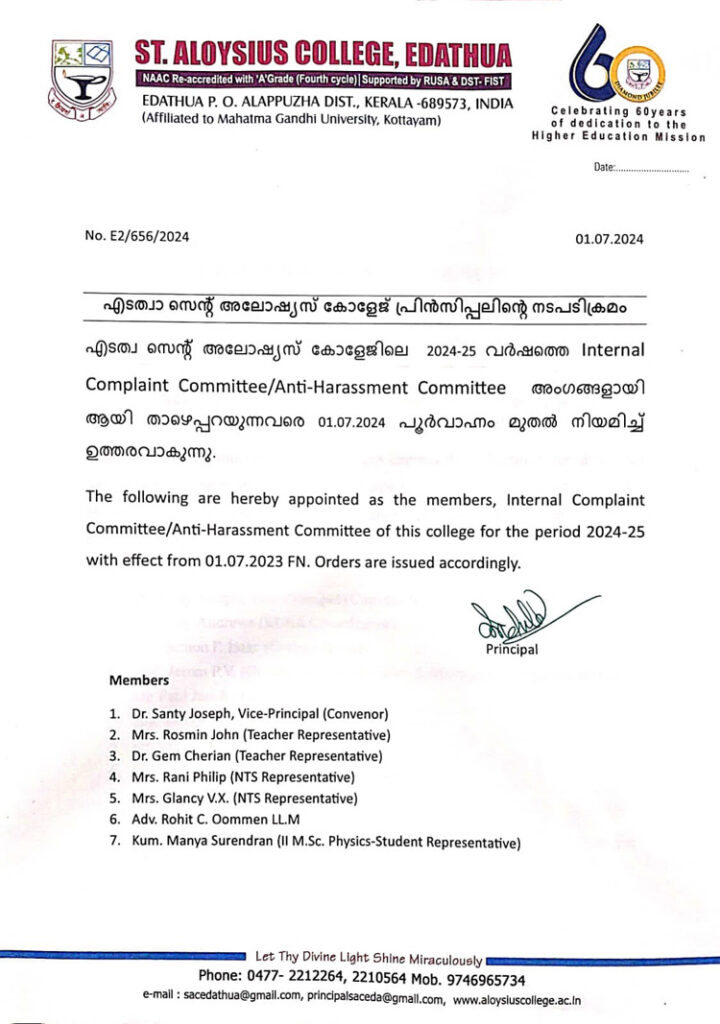 The aspect of women’s progress and development is related to the standard of women’s freedom, security, aspirations and above all, dignity. Maintaining the dignity of human life by giving totally conducive physicals social, political and economic opportunities to realize the fullest potential is an ideal. The judgment of the supreme Court of India, Vishaka versus the State of Rajastan, dated August 13, 1997, makes it legally as well as morally imperative upon all institutions where women are employed, to provide a safe working environment. This landmark judgment makes it clear that each incident of sexual harassment is a violation of fundamental rights of “Gender Equality” and the “Right of Life and Liberty”. Another judgment of Supreme Court on 21 January, 1999 (Apparel Export Promotion Council vs. Chopra) has stated that sexually harassing behaviour is incompatible with the “dignity and honour of a female” and needs to be eliminated as there is no compromise on such violations. In accordance with The Sexual Harassment of Women at workplace (prevention, prohibition and Redressal) Act, 2013 St. Aloysius College Edathua has constituted an Internal Complaint Committee.